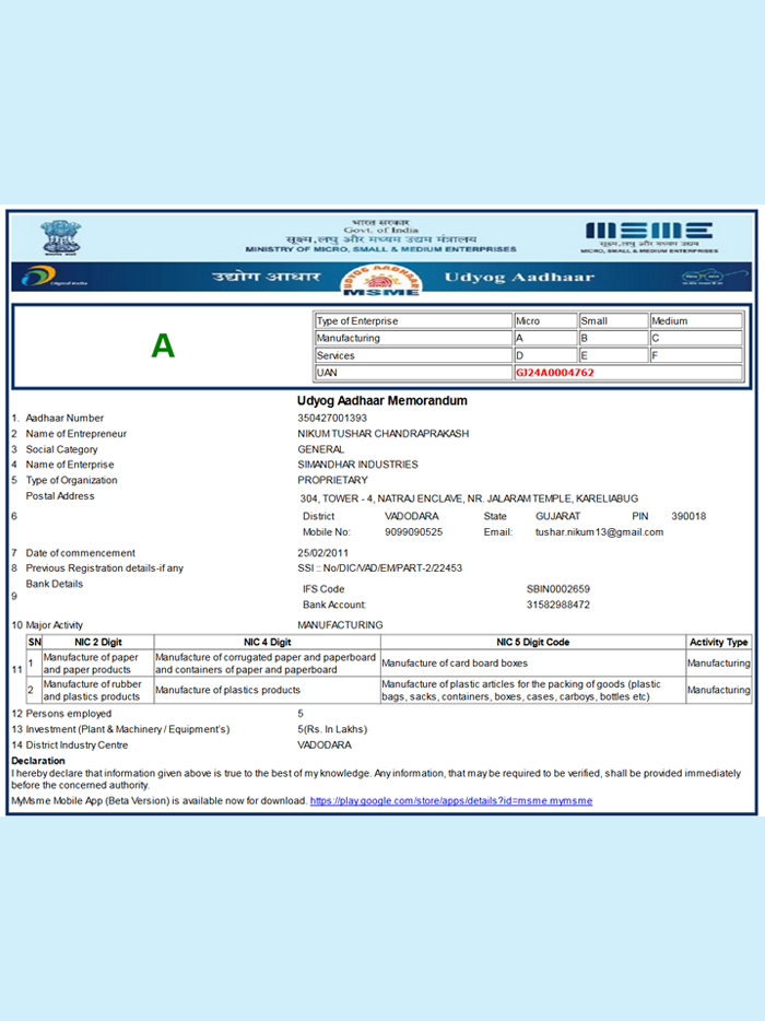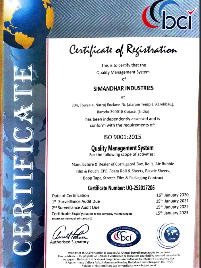 Simandhar Industries is a quality conscious packaging manufacturing company and believe in offering quality products to our clients. We are ISO 9001:2015 certified and our products are manufactured using high grade raw material which is procured from certified vendors.
